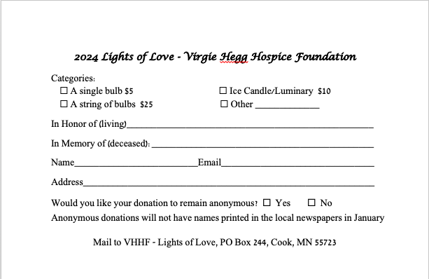 Download and Print the 2024 Lights of Love Donation Form below and mail to VHHF 2024 LOL, PO Box 244, Cook, MN 55723. Or donations can be made via PayPal or Venmo. Both links are below. Click the Donate button to make a donation via PayPal. Be sure to include the name of the loved one you are honoring or memoralizing.